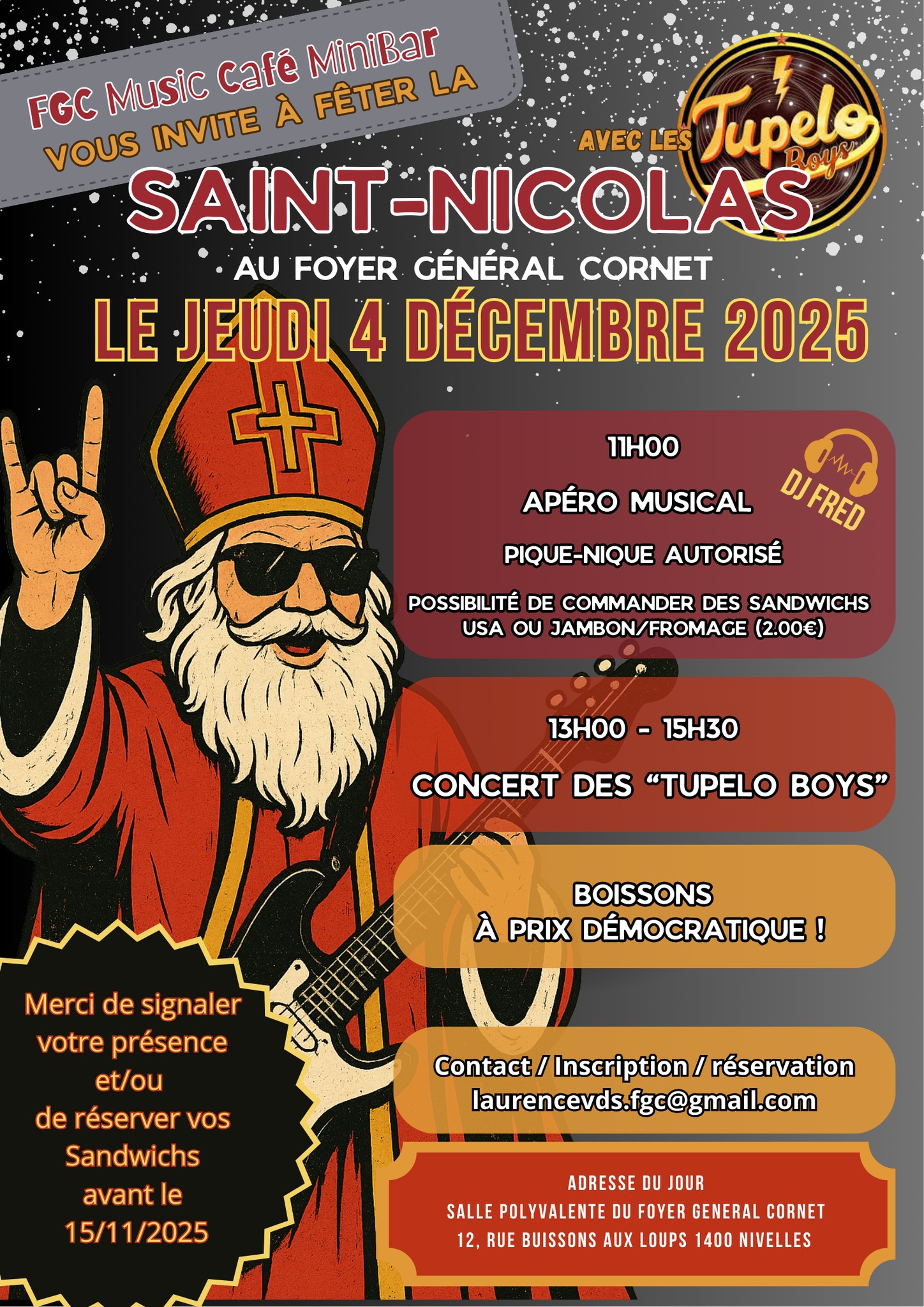 Le Foyer Cornet organise : La fête de Saint-Nicolas Quand ? Le mardi 4 décembre : 11h Apéro musical avec DJ Fred ! 13h - 15h30 : Concert de Tupelo […]